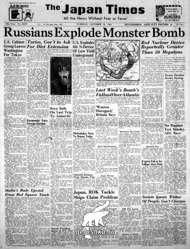 "Бомба... показала мощность больше расчетной - 57 мегатонн, сообщает сын Хрущева Сергей Никитич. - Одновременно с ней конкурирующие коллективы разработчиков сделали бомбы в 25 и 100 мегатонн, но их никогда не испытывали". И слава богу!