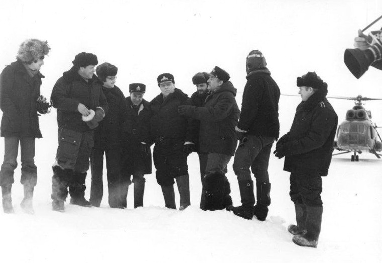Члены съемочной группы кинофильма и командование. Первый слева - художник-постановщик Д.Богородский, третий слева - режиссер-постановщик А.С. Кордон, пятый - главный консультант фильма адмирал Н.Д. Сергеев, седьмой - командующий Новоземельской базой ВМФ вице-адмирал С.П. Кострицкий.