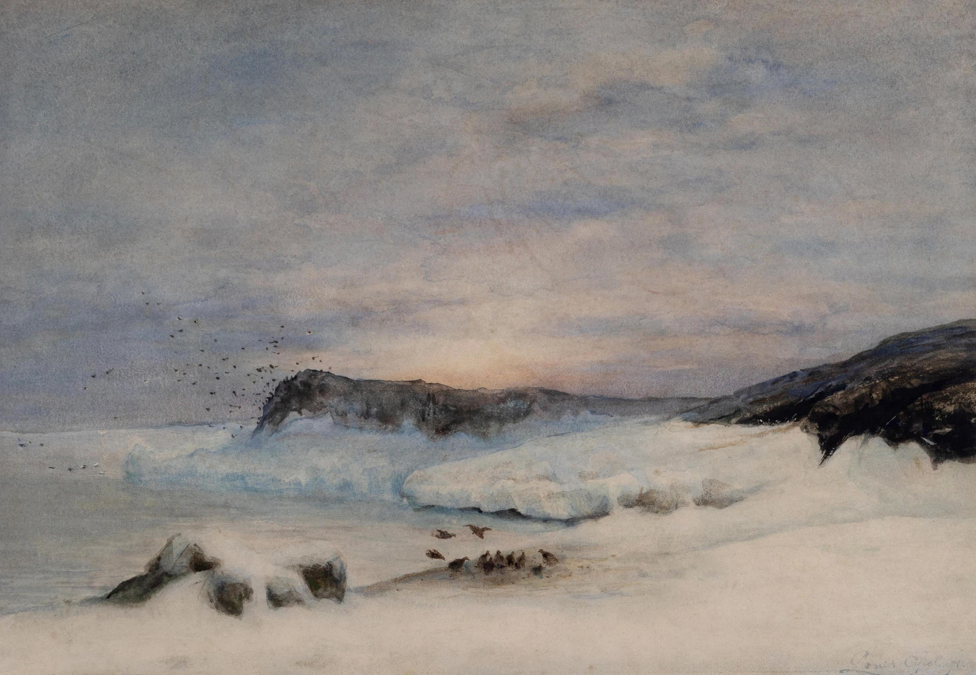 ![]() Луи Аполь (1850–1936) — прославился зимними пейзажами, но главным приключением его жизни стала экспедиция 1880 года на Новую Землю. На паруснике «Виллем Баренц» он создал более 200 рисунков, запечатлев суровую красоту Арктики. Его работы — уникальное сочетание искусства и науки: точные изображения льдов и северного сияния позже изучали географы. Сегодня эти картины особенно ценны — они показывают Арктику, которой больше нет. Короткая экспедиция (корабль повредили льды) сделала Аполя последним свидетелем «нетронутой» эпохи Севера. Подробнее о художнике Полярная одиссея Луи Аполя: искусство, история и ледяные горизонты |