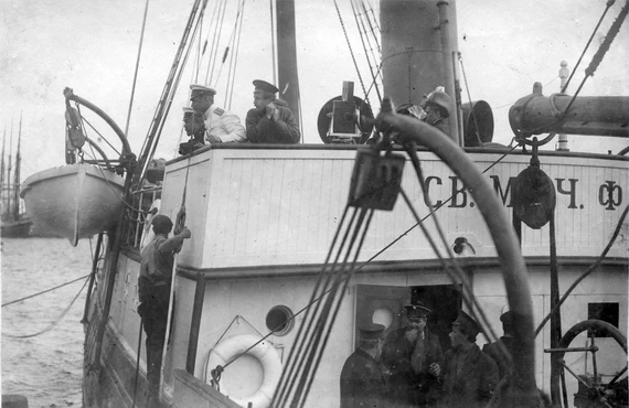 Пароходъ Мурманскаго общества "Королева Ольга Константиновна" приготовляется къ отплытію отъ Соборной пристани въ Архангельскѣ внизъ по Двинѣ, черезъ Бѣлое море, въ Ледовитый океань для совершенія очередного рейса на Новую Землю. Пароходъ запоздалъ отходомъ. Всѣмъ надоѣло ожиданіе, и работа по ошвартовкѣ идетъ быстро и оживленно. На носу парохода слышна сдержанная, любовная перебранка между отъѣзжающей партіей плотниковъ, матросами и провожающими ихъ земляками...
