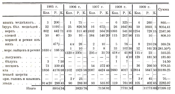 Чтобы дать приблизительное представление о количестве и стоимости промысловой добычи новоземельских самоедов, позволю себе привести цифровые данные за пять лет, взятые из таблицы № 3, приложенной к статье Б. И. Садовского "Русская колонизация Новой Земли".