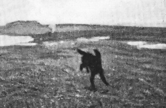 На бегу я вспоминаю, что у меня с собой аппарат, и жаль пропустить такой замечательный случай. Останавливаюсь, навожу аппарат— в поле его Рекс и медведь, довольно близко, шагах в пятидесяти. К сожалению, на фокус навожу несколько поспешно, и снимок выходит туманный.