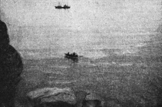 "Персей" еще не успел стать на якорь, как уже спускают моторную лодку, и мы спешим к берегу. Надо успеть осмотреть береговые утесы, пока на мысе будут ставить знак — деревянную пирамиду. Мы везем лес для этого знака, ломы, топор.
