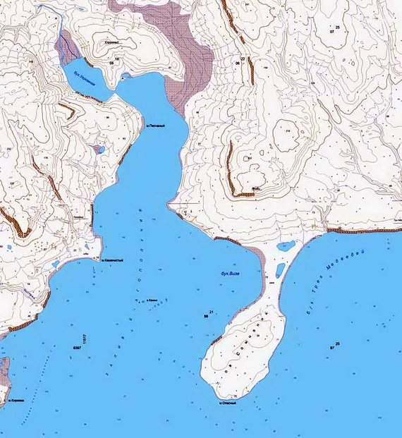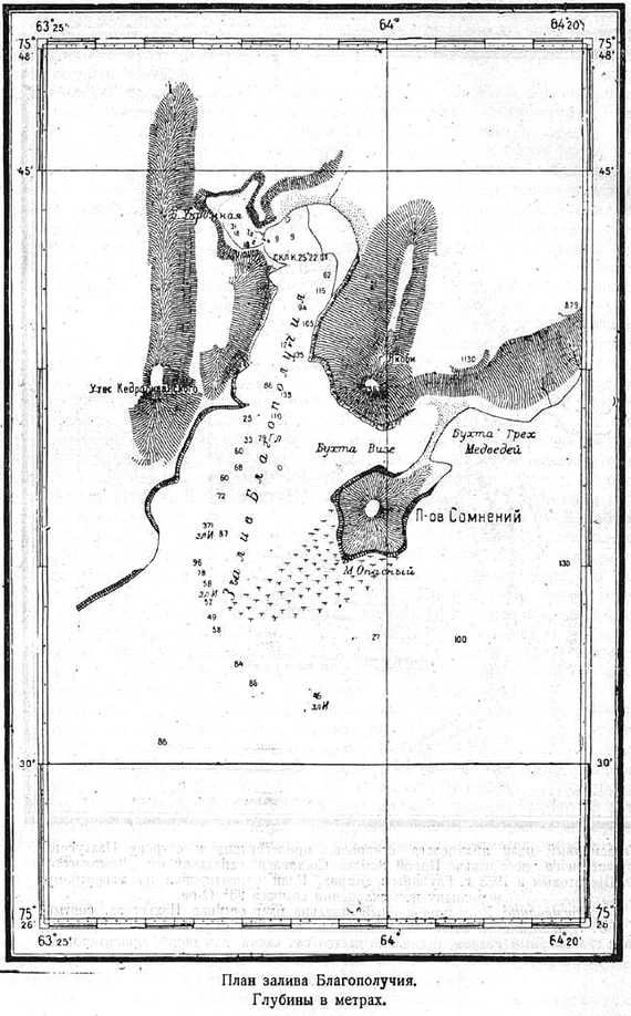 На широте 75°41’59″N (долгота 63°43’11″E) экспедиция обнаружила вдающийся в сушу фьорд. Уже в наше время выяснилось, что его длина 12 км, ширина в наибольшей части, в устье, — 6 км, а максимальная глубина — 180—200 м; со дна вход в залив "преграждает" 40-метровый порог. Залив частично изолирован от акватории Карского моря островом Камни, который расположен на входе в залив. Этот остров можно обойти с запада или востока, причём по имеющимся батиметрическим картам максимальная глубина западного прохода не превышает 37 м, а восточного доходит до 57 м.
