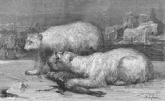 Но хотя животный міръ Новой Земли и неразнообразенъ, все-таки онъ несравненно совершеннѣе, чѣмъ скудная, чахлая ея растительность. Изъ сухопутныхъ млекопитающихъ мы, во-первыхъ, находимъ здѣсь бѣлаго медвѣдя, или ошкуя — царя полярныхъ пустынь, который встрѣчается на всемъ островѣ, но преимущественно водится по сѣвернымъ и восточнымъ берегамъ. Пища бѣлыхъ медвѣдей состоитъ изъ разной падали и морскихъ животныхъ, особенно тюленей, но иногда даже моржъ, не смотря на всю свою силу, одолѣвается одинъ-наодинъ медвѣдемъ и становится его добычей. Встрѣчи съ такимъ сильнымъ и свирѣпымъ звѣремъ очень опасны, но подчасъ медвѣдь обнаруживаетъ большую трусость. Пахтусовъ приводитъ нѣсколько случаевъ, когда перепуганные появленіемъ медвѣдя люди отъ страха принимались кричатъ и этимъ такъ пугали звѣря, что тотъ безъ оглядки убѣгалъ.