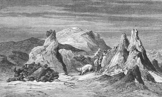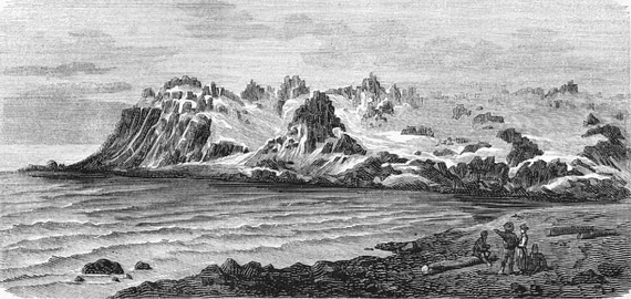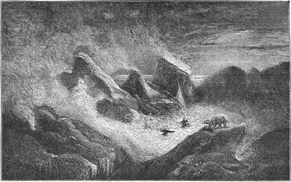 Дикія и угрюмыя картины суровой полярной природы смѣняются одна за другою передъ глазами путешественника, плывущаго вдоль береговъ Новой Земли. За исключеніемъ плоской южной ея оконечности, повсюду на западномъ берегу видны обнаженныя каменныя громады, которыя то круто низвергаются въ море, волнующееся у ихъ темныхъ подножій, то тянутся рядами отдѣльныхъ вершинъ въ нѣкоторомъ разстояніи отъ берега. Острые обломки вывѣтрившихся скалъ, раскиданные по склонамъ горъ, усиливаютъ характеръ дикости и запустѣнія страны. Порой гдѣ нибудь въ глубинѣ бухты покажется полуразвалившаяся изба, съ группой высокихъ могильныхъ крестовъ — мѣсто стоянки неустрашимыхъ промышленниковъ Сѣвернаго океана, и еще тяжелѣе станетъ на душѣ у путника. Чѣмъ далѣе подвигаешься на сѣверъ, тѣмъ горы становятся выше, массивнѣе и многочисленнѣе, а у Маточкина Шара онѣ учащаются до того, что взорамъ представляется одинъ только лабиринтъ горъ самыхъ разнообразныхъ формъ. Отсутствіе растительности придаетъ ландшафту мрачный, безжизненный видъ, и повсюду, вмѣсто живой природы болѣе счастливыхъ странъ, наблюдатель встрѣчаетъ одинъ только суровый каменный скелетъ земли.