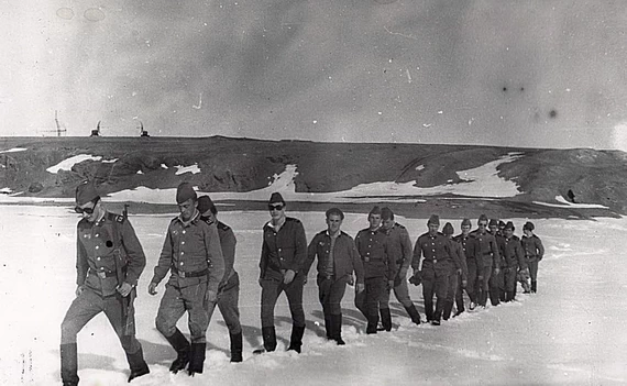 В 1932–1933 годах в этой части Новой Земли базировалась советская геофизическая полярная станция "Русская Гавань", участвовавшая в программе Второго международного полярного года (II МПГ). Её возглавлял молодой учёный-геолог М.М. Ермолаев, фактически давший начало геофизическим методам исследований в геологии. Согласно его программе по всей стране была развёрнута сеть подобных станций, а станция на Новой Земле стала головной в этих исследованиях. Как в 1970 году писал ветеран исследований на полярной станции "Русская Гавань" З.М. Каневский, сюда "отправились семеро. <…> Начальник, он же геолог, гляциолог, геофизик, – Ермолаев. Метеоролог – М. Карбасников, географ и ботаник – А. Зубков, механик и водитель саней – B. Петерсен, каюр – ненец Яша Ардеев, плотник – Сахаров. Седьмым был чужеземец, немецкий геофизик доктор Курт Вёлькен".