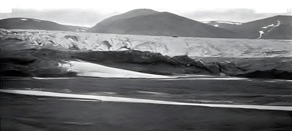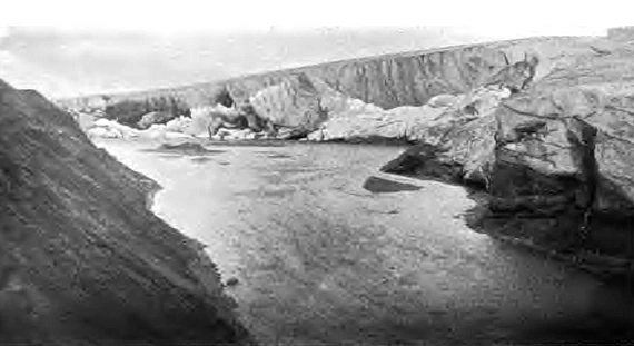 Спустившись съ холма, мы имѣли случай наблюдатъ разгруженіе ледника или, такъ сказать, "рожденіе ледяныхъ горь". Огромныя массы ледяного утеса обвалились въ воду, разломившись по линіи одной изъ разщелинъ. Сначала мы увидали, что частъ фасада ледника задвигалась, заколыхалась и потомъ обвалилась; поднялись облака брызгъ, раздался гулъ, подобный грому и покатились огромные концентрическіе круги волнъ. Хотя нѣсколько большихъ частей обвалившагося ледяного утеса осѣли, повидимому, на подводный край ледника, но все-таки вокругъ плавали обломки, величиною съ добрый домъ, и цѣлымъ вѣеромъ распространились эти глыбы на поверхности моря на протяженіи версты или двухъ.