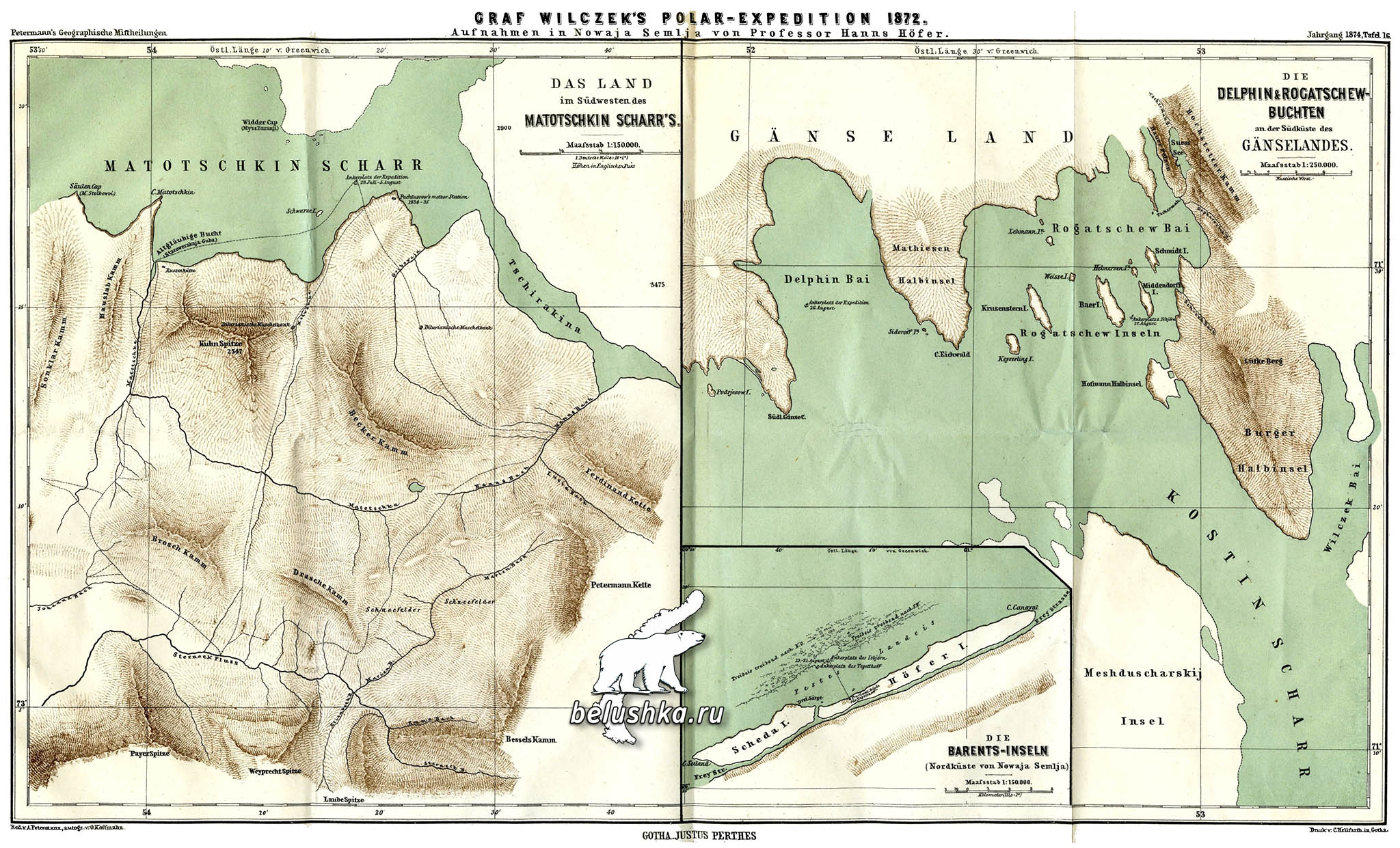 Идя самымъ малымъ ходомъ и все время измѣряя глубину, вошли въ Губу, которая, хотя и казалась гораздо уже показанной на картахъ, но по своему расположенію должна была быть Губой Бѣлушьей (на планѣ Моисѣева "Бѣлужья Губа", промышленники же называютъ ее "Бѣлушьей", производя это названіе оть "бѣлуха" — большой бѣловатый дельфинъ, живущій въ этихъ водахъ; Delphin Buchte — на австрійской картѣ). Войдя въ Губу, увидѣли на западномъ берегу ея, въ 2 миляхъ отъ входа, жилище самоѣдовъ, противъ котораго и стали на якорь.