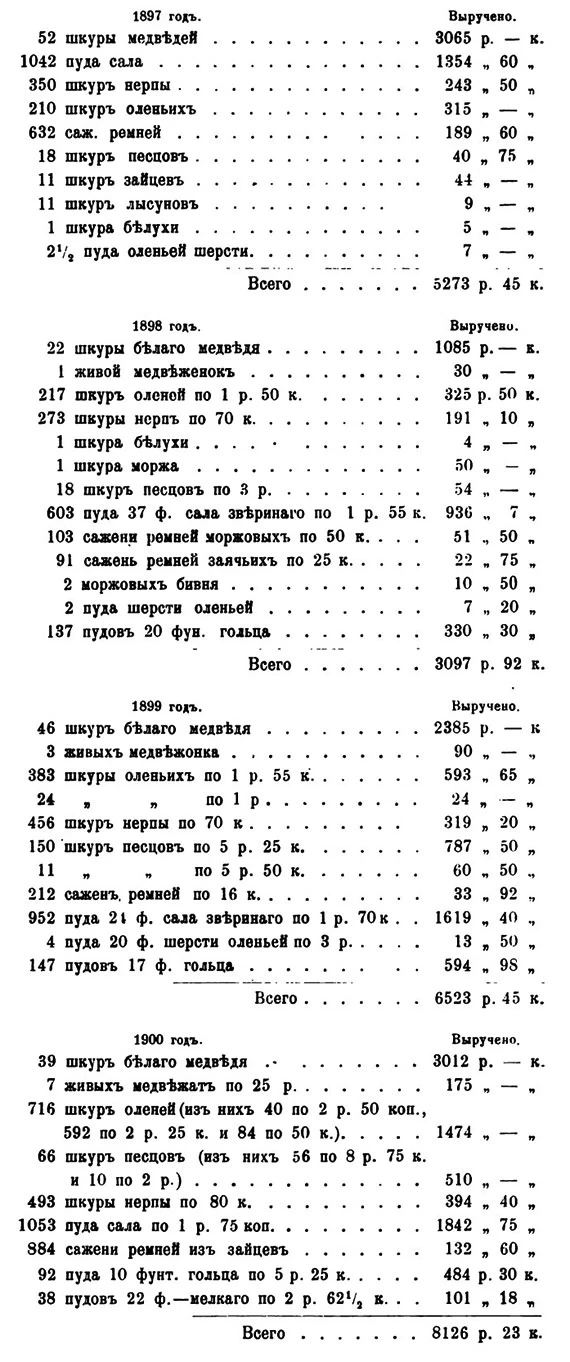 Воть цифры предметовъ промысла за послѣдніе четыре года, добытыхъ Новоземельскими колонистами и проданныхъ въ Архангельскѣ.