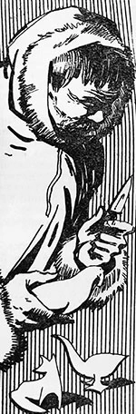 В марте на станции заночевали охотники из Малых Кармакул — Михаил Вылка и молодой ненец Зосима. Это имя свидетельствовало, что родители Зосимы были в свое время обращены в христианство монахами-миссионерами, зимовавшими в Малых Кармакулах. Михаил Вылка, родной брат известного ненца-художника Ильи Вылки, — уже пожилой человек небольшого роста, кажущийся еще меньше благодаря привычке ходить несколько согнувшись. Многие северяне аборигены усваивают эту привычку, обусловливаемую, вероятно, ходьбой при сильных ветрах, ездой на собаках и жизнью в низких жилищах (чумах, тордохах, ярангах и землянках). Удивительно скромный и добрый человек, Михаил, как и его брат, был настоящим художником, тонко чувствовавшим и подмечавшим характерные черты полярной природы и быта.