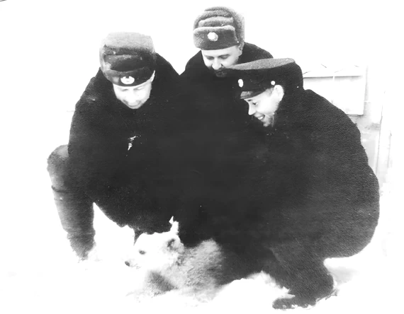 В хозяйственных службах аэродрома "Залив Течений" содержалось, как правило, несколько медвежат. Пока они были маленькими, с ними можно было даже поиграть. Но через несколько месяцев они становились опасными для людей и собак, их пристреливали. На снимке: штурман эскадрильи майор В.И. Никитин, командир корабля подполковник Н.И. Ивашов, начальник связи эскадрильи ст. лейтенант В.Г. Даев Они еще не знают, в какого зверя превратиться этот милый на вид звереныш...