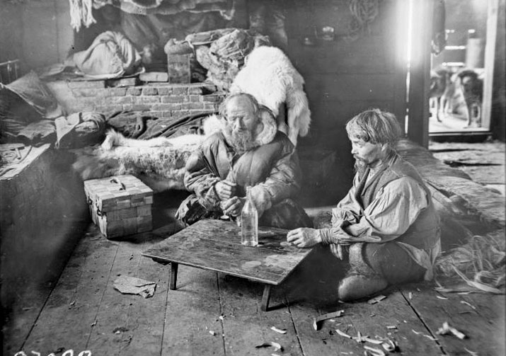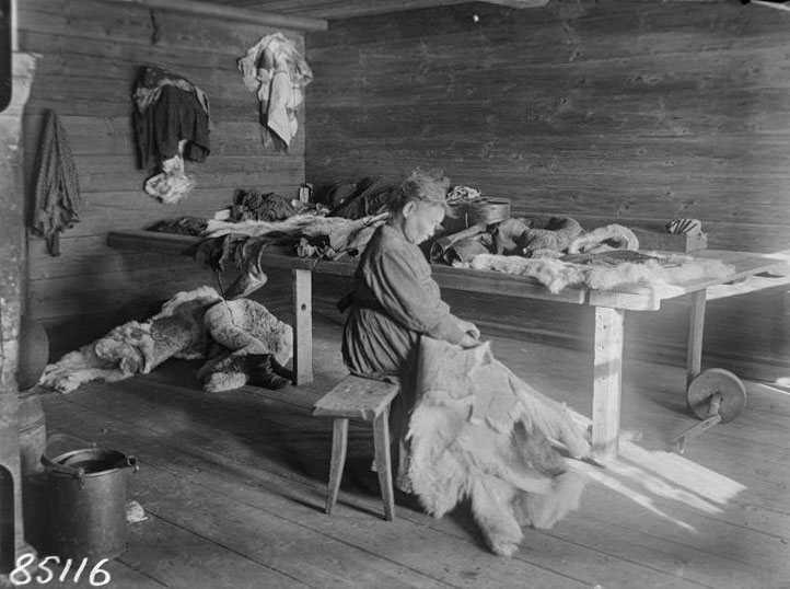 - Маточкин Шар. Жена Ефима выделывает шкуру оленя.