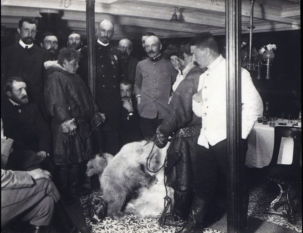 - На борту парохода "Ольга". Ненцы становища Белужье преподносят французской полярной экспедиции для передачи французскому президенту двух белых медвежат. Новая Земля