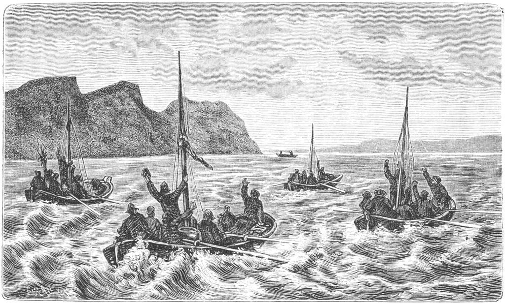 12-го августа одна изъ моихъ шлюпокъ увидала въ морѣ недалеко отъ береговъ Новой Земли четыре неизвѣстныя шлюпки, въ которыхъ помѣщались 23 человѣка; замѣтя ихъ, одна изъ моихъ шлюпокъ отправилась къ нимъ на встрѣчу, но недоѣзжая до нихъ, изъ неизвѣстныхъ шлюпокъ сдѣланъ былъ спрось: "Что вы Русскіе ли“, на что съ моей шлюпки отвѣтили, что Русскіе, тогда они взяли съ моей шлюпки одного матроса для препровожденія въ Становище, въ разстояніи 8 верстъ, на мою шкуну, гдѣ я стоялъ на якорѣ.