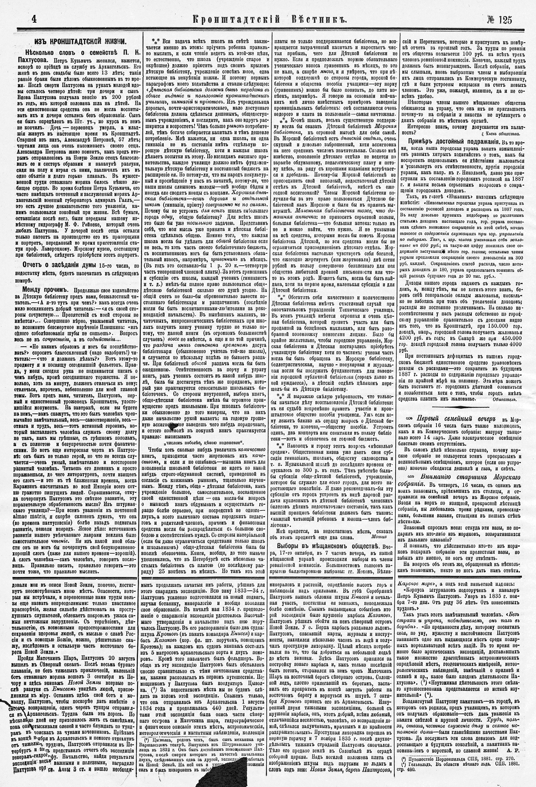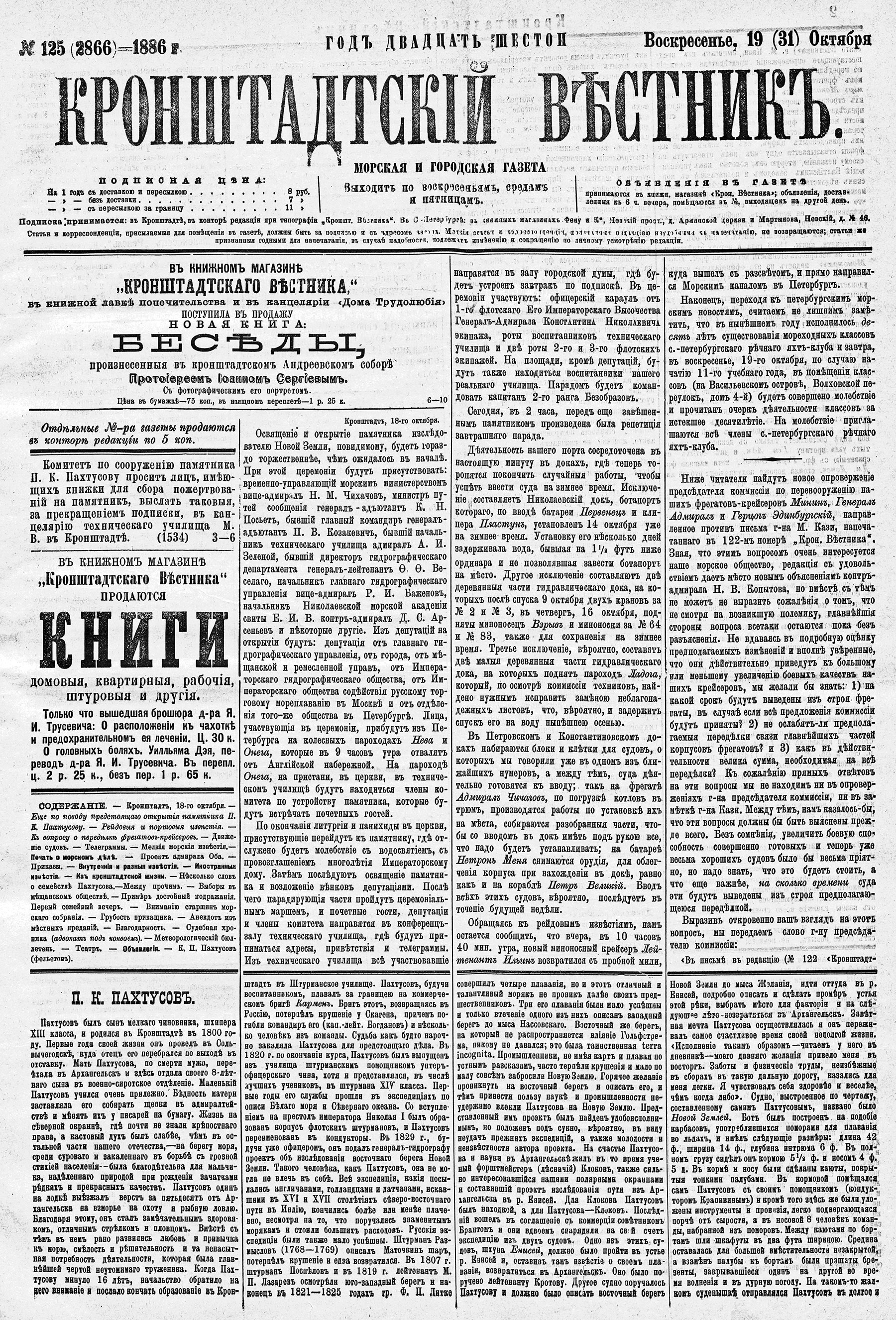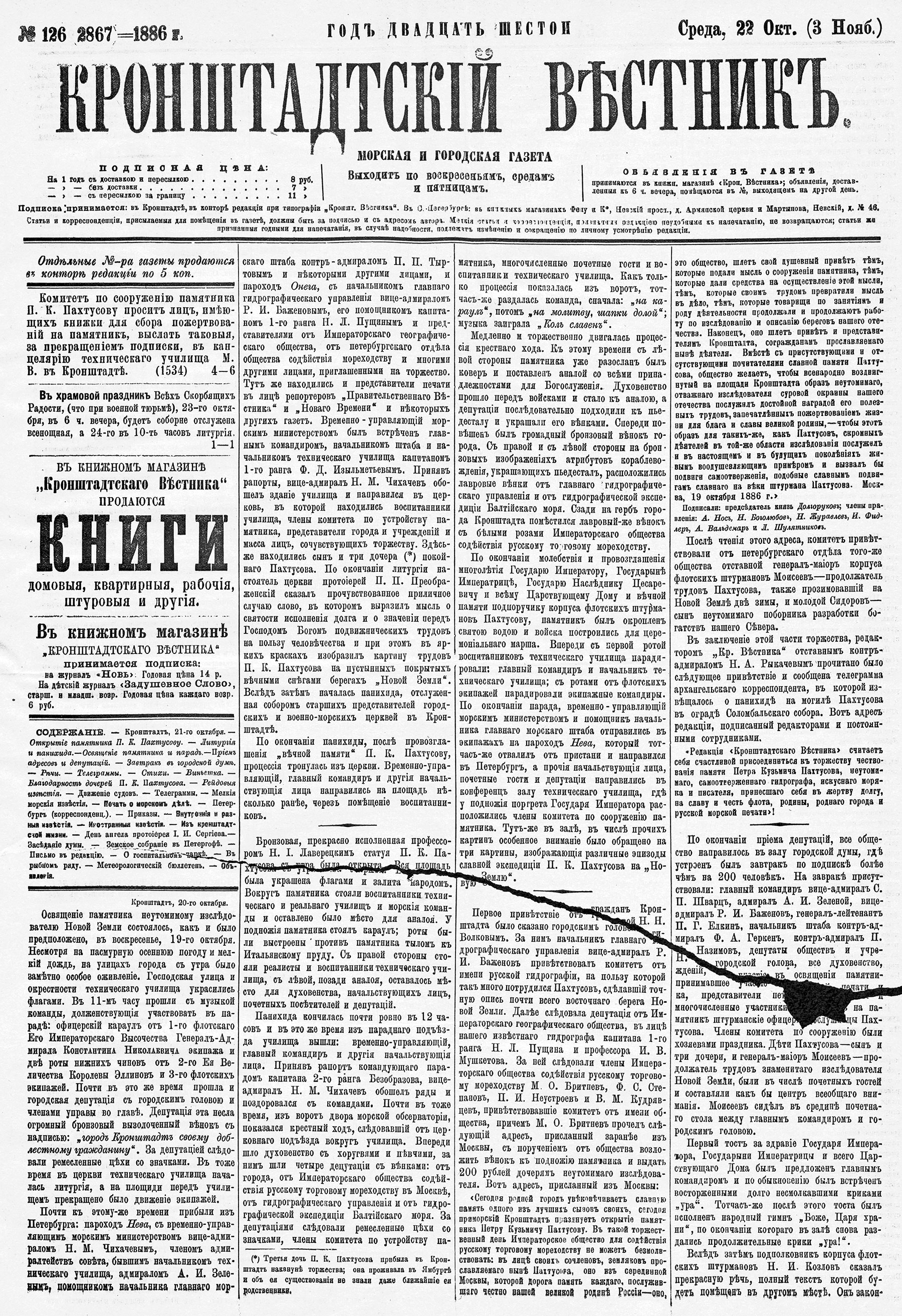 Газета "Кронштадтский вестник" №№125-126 1886 г. со статьей о П.К. Пахтусове и репортаже об открытии ему памятника.