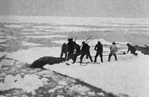 Моржи появились въ февралѣ, и находились только до іюня, а особенно было много въ мартѣ и апрѣлѣ. Но охоту на нихъ промышленники не производили: не было для этого лодокъ, которыя можно было бы таскать по льду, а были оставлены два карбаса для бѣлужьяго промысла, и одна маленькая осиновка, въ родѣ челнока, въ которой могли поместиться только два человѣка, да и та потеряна въ сильную бурю. До марта мѣсяца промышленники не видали льдовъ, которые носились бы около береговъ Новой Земли; а если и замѣчали иногда, то это былъ ледъ изъ заливовъ острова, оторванный сѣверо-восточными вѣтрами. Ревъ моржей въ мартѣ мѣсяцѣ, когда началъ приближаться полярный ледъ, былъ слышенъ промышленниками въ самой избѣ, и далѣе внутри залива. Они видѣли, какъ моржи плавали близь краевъ полярнаго льда. Былъ и такой случай, что одинъ изъ промышленниковъ подстрѣлилъ нѣсколько нерпъ, одну изъ нихъ тяжело раниль, и по неимѣнію лодки не могъ ею воспользоваться. На другой день, онъ пошелъ посмотрѣть, не принесло ли ее къ торосу, въ чемъ и не ошибся: нерпа к нему примерзла.