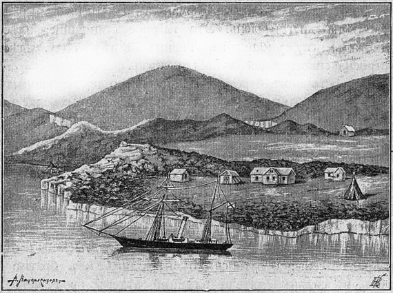 На восточномъ берегу бухты построено два деревянныхъ дома со службами. Близъ нихъ двѣ деревянныхъ же небольшихъ церкви. Дома построены прочно; стѣны двойныя, промежуток между ними около двухъ футовъ; рамы тройныя. Комнаты свѣтлы и просторны: въ одномъ домѣ, побольше, ихъ три, въ другомъ двѣ. Послѣдній занимаютъ самоѣды. При домахъ есть баня, кузница и большая кладовая; здѣсь хранятся спасательныя принадлежности: пробочные круги, складныя лѣстницы, веревки и проч.