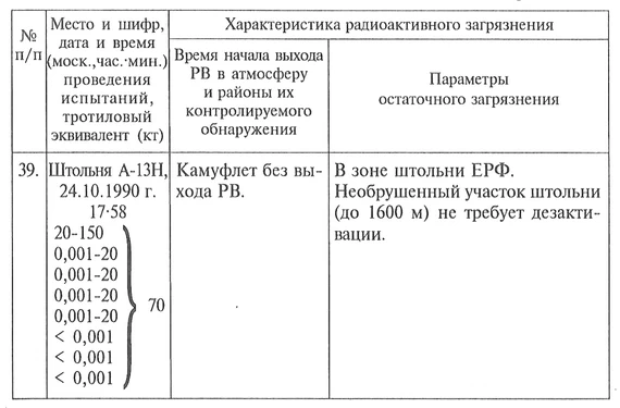 Всего было восемь зарядов. Те, что меньше одной тысячной килотонны — это исследовательские, маленькие заряды. С мощностью меньше 0,001 кт — заряды в аварийных режимах, специально проводились опыты, чтобы узнать, как ведет себя заряд в случае отказа какой-нибудь из систем блока автоматики, какую он мощность выдаст? Просто ликвидируется или будет какое-то энерговыделение? Эквивалентная суммарная мощность группового этого подрыва была зафиксирована, как 70 кт. После опыта был проведен экспресс-анализ полученных результатов измерения, а в последующем их повторная обработка. Вся полученная информация передавалась предприятию-разработчику заряда (сейчас это два Российских Федеральных ядерных центра — в Сарове и Снежинске).